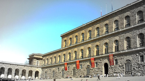 Грандиозный палаццо Питти. Весь фасад здания более 200 м в длину и 35 м в высоту покрывает облицовка рустом из огромных блоков, что создает впечатление мощи и величия.