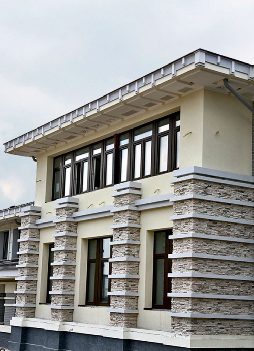 Природный камень устойчив к механическим воздействиям, красив. К минусам можно отнести большой вес каменной отделки, под которую нередко нужно усиливать фундамент, создание специальных конструкций для крепления, трудоемкость и длительность отделочных работ. Для облегчения нагрузки на фундамент выбирают дизайн фасада, предусматривающий частичную отделку декоративным камнем цоколя, углов здания, наличников на окна, портал дверей.